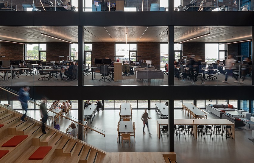 The ground floor provides a reception area, meeting rooms, bistro and gym facility. The atrium contains an impressive stretch of bleacher seating leading up to the first floor, providing a dramatic space for presentations and events. The building also boasts a diverse range of informal training and presentation suites with the latest AV and video conferencing technology.